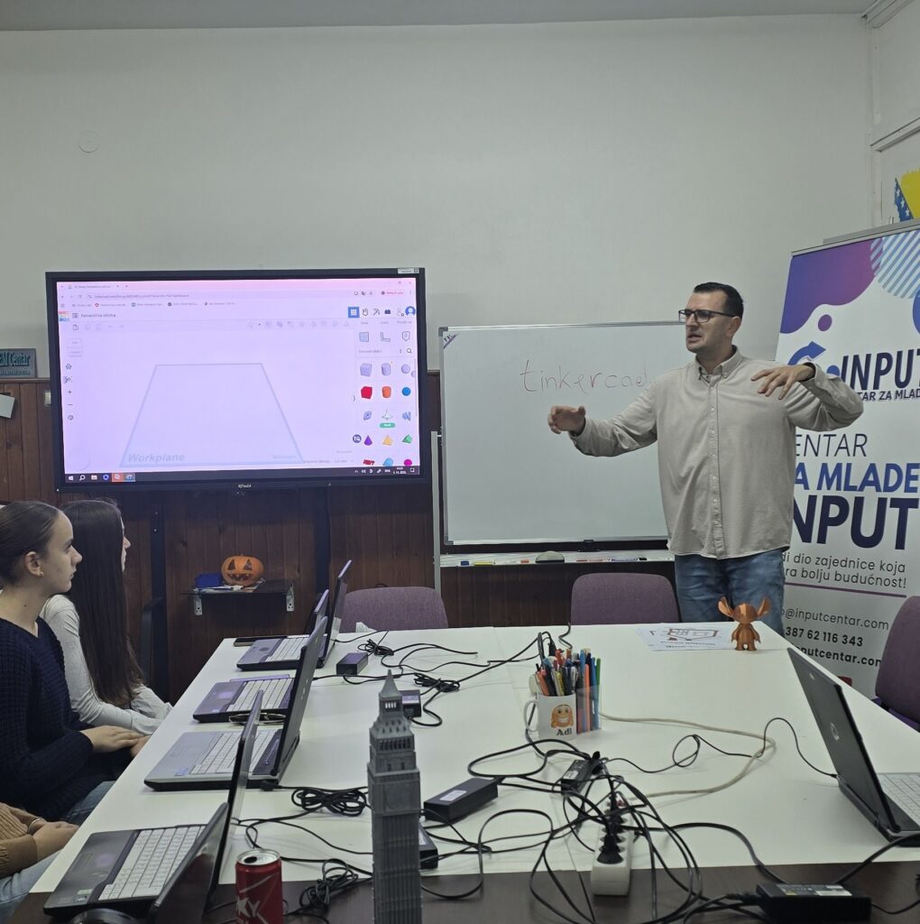 U Centru za mlade INPUT održana je edukativna radionica 3D modeliranja i printanja za članove Interact Cluba Zenica. Pod vodstvom Adija Salčinovića, mladi su se upoznali s osnovama savremenih 3D tehnologija i njihovom praktičnom primjenom.